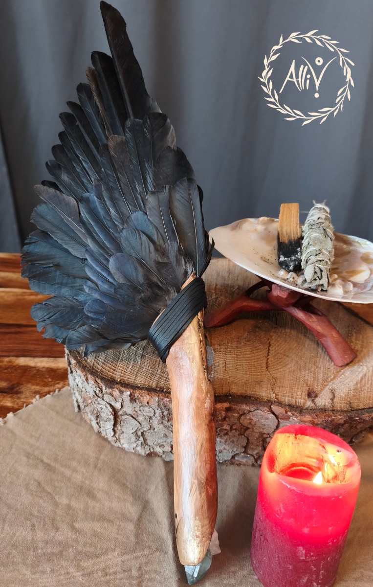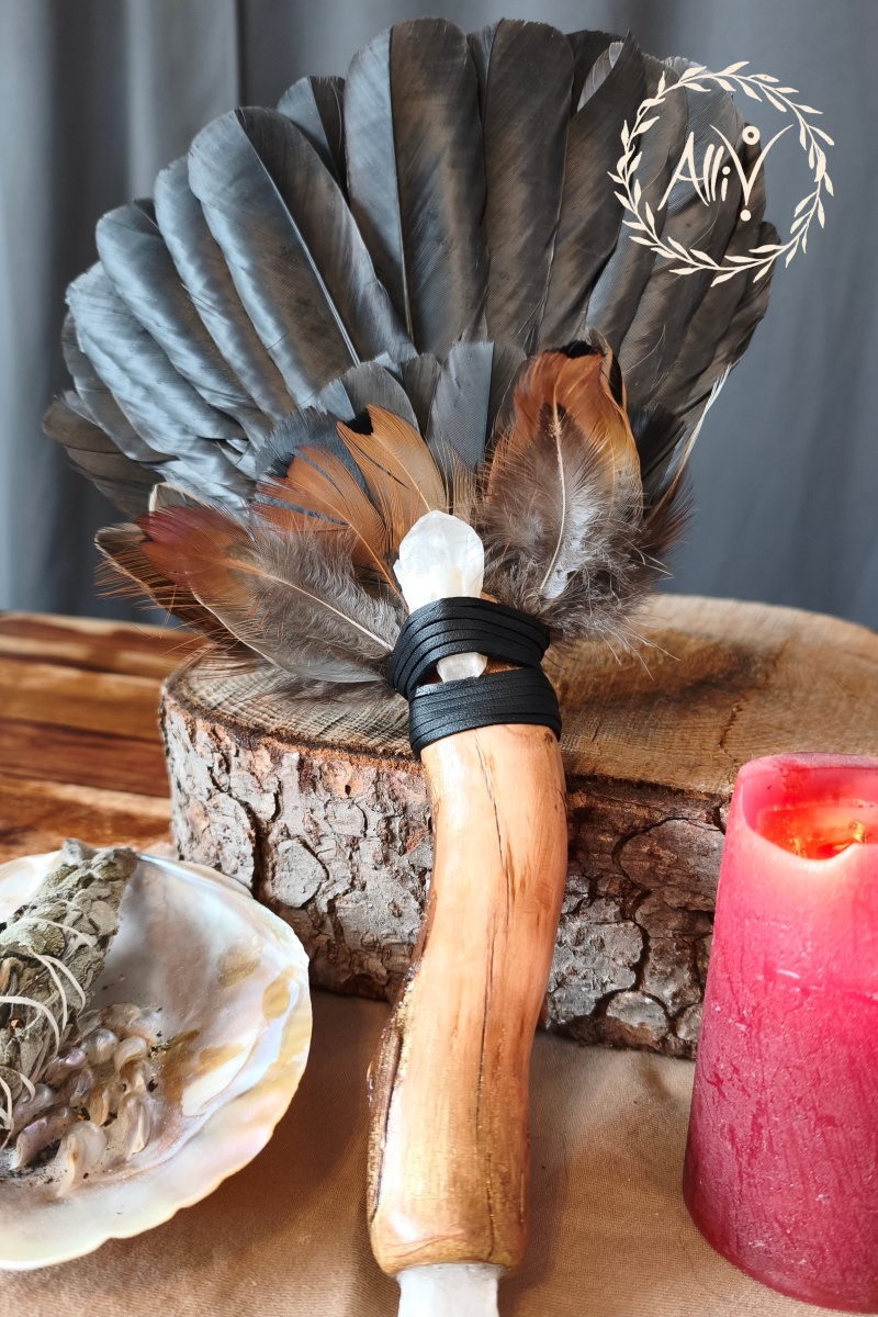 na rozvíření dýmu vykuřovadel, který doprovází zvuk makovic. Vějířem směřujete dým z vykuřovadel, který slouží k očištění sebe, prostoru nebo čehokoliv jiného. Je to velmi magický rituální nástroj. Ptačí peří je prostředníkem mezi nebem a zemí, s vějířem můžete i meditovat a doprovázet se zvukem z makovic.